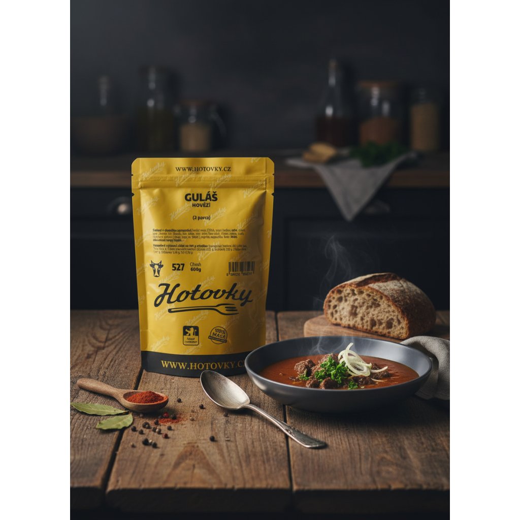 Zloženie v okamihu spracovania: hovädzie mäso (30 %), vývar (mrkva, zeler, cibuľa, korenie, cesnak, soľ, ligurček, kurací skelet, bravčové kosti, hovädzí orez), ryžová múka, masť, paradajkový pretlak (voda, paradajka, modifikovaný škrob), paprika, majoránka, rasca.